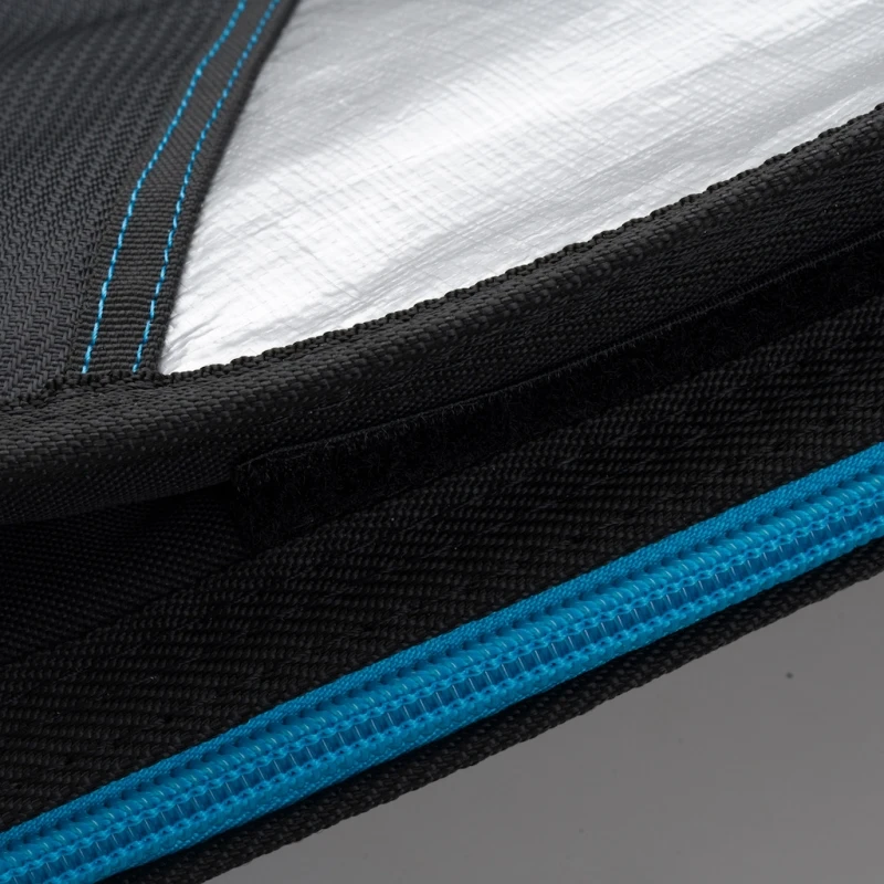 This Bulldog 7ft1 surfboard bag is perfect for wider hybrid and fish style surfboards. It has 5mm padding in the main body, and a rugged outer that makes it a great for everyday protection. The bag has a super tough polyester fabric outer on one side and a heat reflective water resistant material on the other. Extra 10mm reinforcing on the nose and tail areas will help keep your board safe from knocks and wear from the fins.