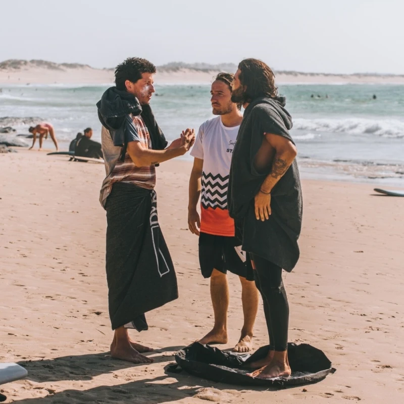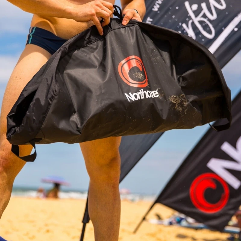 The simplest ideas are often the best and this certainly applies to sports changing mats. This super tough, waterproof bag folds out into a flat 1m diameter circle for standing on to whilst getting changed. It’s perfect for use in car parks when getting out of wetsuits. Just throw all the wet gear into the bag, pull up the drawstrings and it’s packed neatly away. The material is fully waterproof and very heavy duty so can be washed down and wont leak if a wetsuit is left inside it. Has side carry handles for lugging off the beach when full.